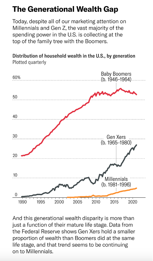 We forget this in part because young people make headlines and look good in ad campaigns. Millennials and Gen Z may drive trends and make headlines in the United States, but Boomers are still the core consumers. They’re the ones who move markets.